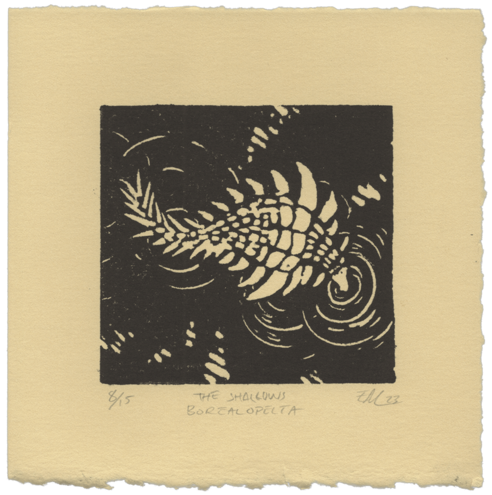 This print is part of a series of small paleoart linocut prints, including The Flock, Sun Worshipper, Pteranodon, The Last Stegosaur, and Dawn Song.